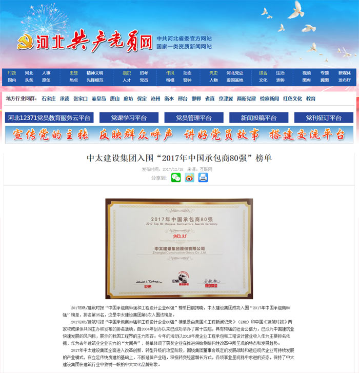 河北共产党员网报道了“中太建设集团入围“2017年中国承包商80强”榜单”